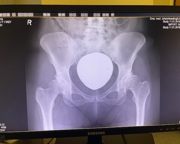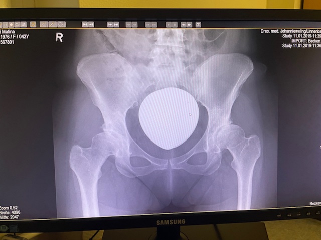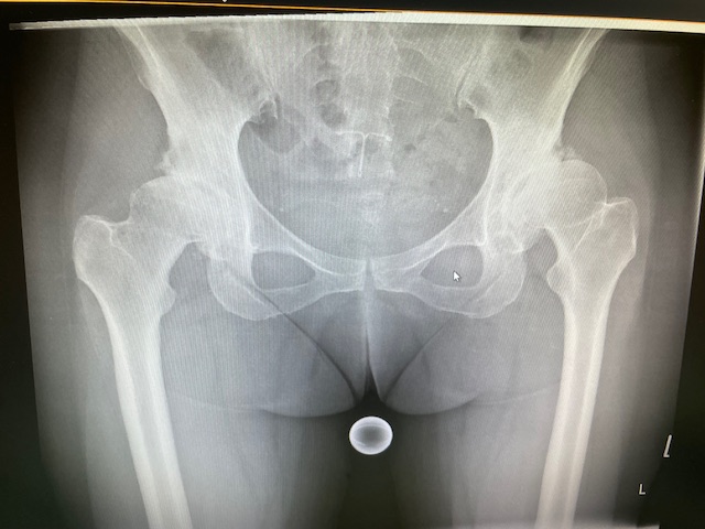 Η ασθενής είχε απευθυνθεί από χρόνια σε πολλούς συναδέλφους ορθοπεδικούς στην Ελλάδα και το εξωτερικό. Είχε προηγηθεί ήδη διεξοδικός απεικονιστικός έλεγχος (ακτινογραφίες λεκάνης και ισχίου, αξονική και μαγνητική τομογραφία).